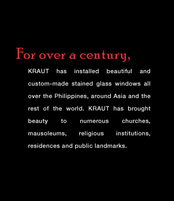 Religious Stained Glass WindowsThe pioneer stained glass maker in the Philippines. The finest stained glass since 1912. FOR OVER A CENTURY, Kraut Art Glass has installed quality, artistic, custom-made and authentic stained glass windows of religious themes for Cathedrals, chapels and mausoleums in Metro Manila, all over the Philippines, around Asia and the rest of the world.